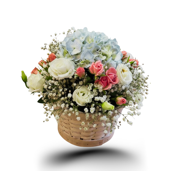 Blush Serenity is a soft and elegant floral basket featuring pastel blue hydrangea, creamy white roses, delicate pink blooms, and airy baby’s breath. Arranged in a natural woven basket, this composition offers a calm, graceful presence with a timeless feel.