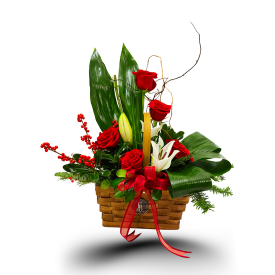 Crimson Harmony is a refined floral basket featuring rich red roses, elegant white lilies, seasonal accents, and lush greenery, thoughtfully arranged in a classic woven basket. Designed to balance warmth and sophistication, this arrangement blends vibrant color with natural texture for a timeless presentation.