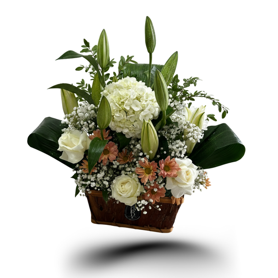 Gentle Solace is a calm and graceful floral arrangement featuring soft white blooms, delicate pastel accents, and fresh greenery, thoughtfully composed in a classic wooden container. Designed to convey comfort and quiet support, this arrangement brings a soothing presence through its balanced form and gentle color palette.