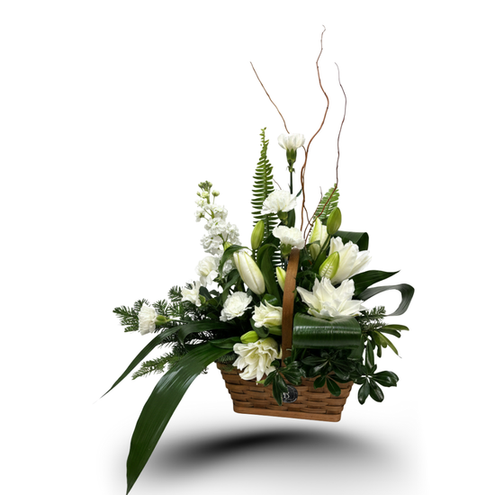 Ivory Balance is a modern sympathy basket arrangement featuring elegant white lilies, soft white blooms, and structured greenery, accented with natural branches for height and movement. Its asymmetrical design creates a calm, contemporary expression of respect and remembrance.