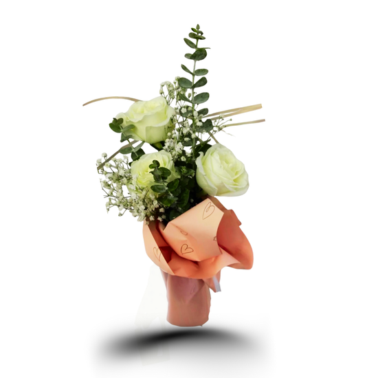 Pure Whisper is a delicate hand-tied bouquet featuring soft white roses, light baby’s breath, and fresh greenery, wrapped in a warm peach-toned paper. Simple in form and gentle in presence, this arrangement speaks through subtle beauty rather than excess.