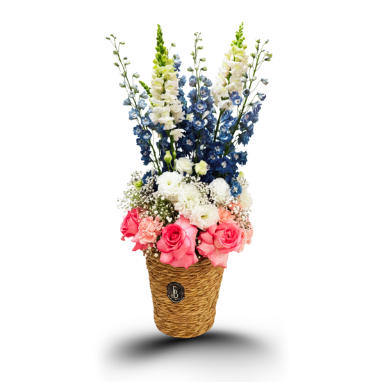 Skyline Grace is a striking tall basket arrangement featuring elegant blue delphiniums, soft white blooms, and vibrant pink roses, layered with delicate fillers and natural greenery. Its vertical design creates a refined sense of height and movement, making it a bold yet graceful floral statement.