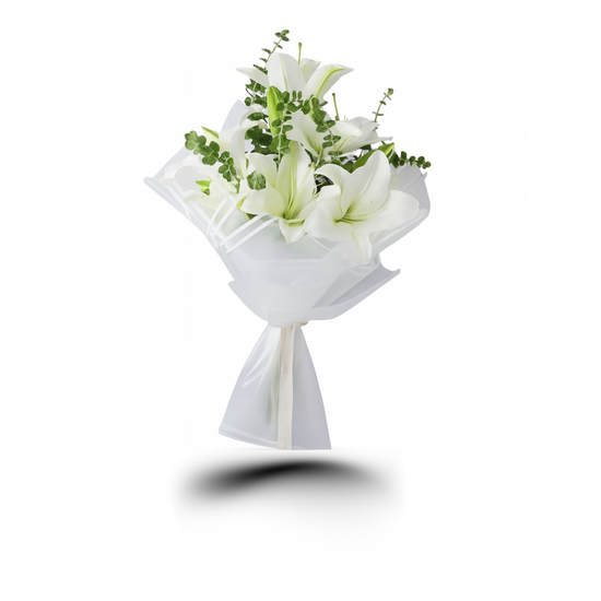 A minimalist bouquet of pure white lilies paired with fresh greenery, wrapped in soft translucent white. A clean, modern, and elegant arrangement perfect for sympathy, celebrations, or refined gifting.