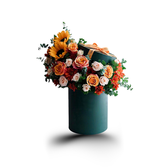 A vibrant premium arrangement featuring sunflowers, peach and orange roses, and textured autumn blooms, artistically designed in a deep emerald cylinder box. A warm, elegant gift for celebrations, gratitude, and special occasions.