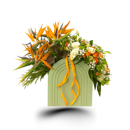 A bold tropical arrangement featuring vibrant Birds of Paradise, creamy roses, orange spray blooms, and delicate fillers. Styled in a pastel green arched box, this artistic composition brings an exotic, modern flair to celebrations and premium gifting.